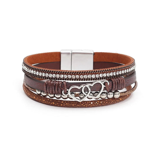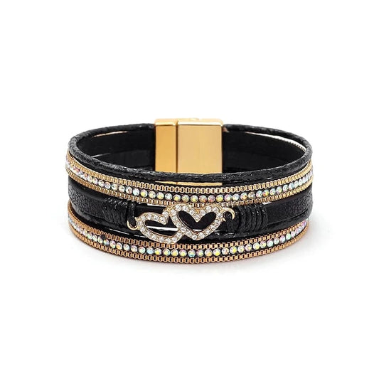 ÉpuiséBracelet Cuir Femme Manchette Strass Éclatant avec Cœur Enlacé et Fermoir Magnétique.