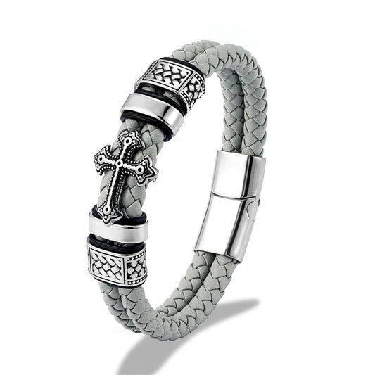 Bracelet Cuir Homme Croix Blanche Élégance Tressée avec Ornements Géométriques