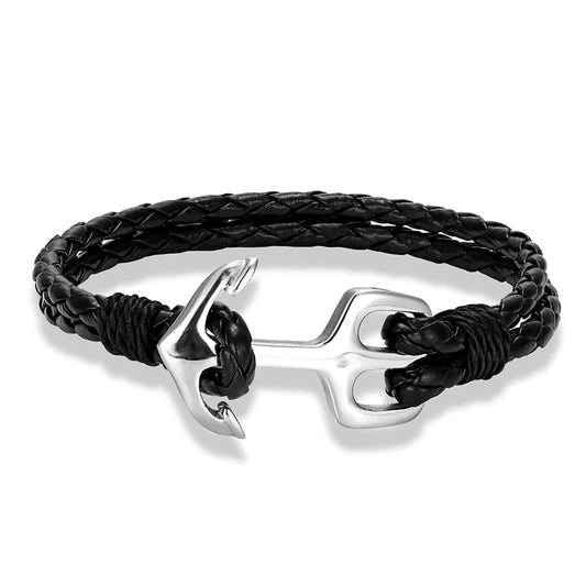 Bracelet Cuir Double Ancre Homme Tressé Élégance Nautique Noir et Beige