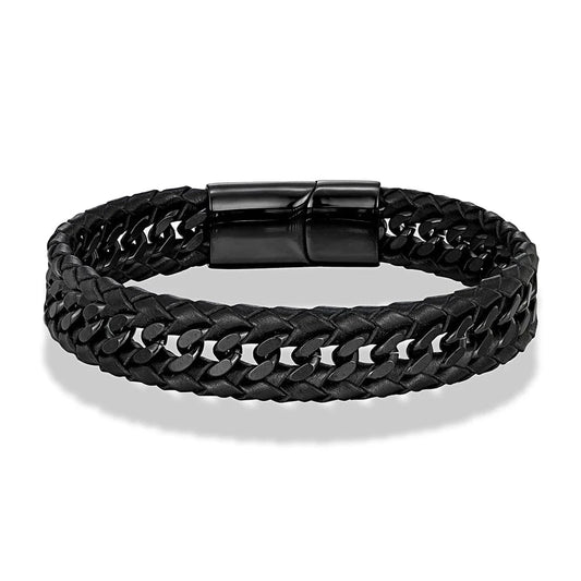 Bracelet Cuir Homme avec Chaîne Moderne Élégante - Style Tressé Noir et Acier Inoxydable