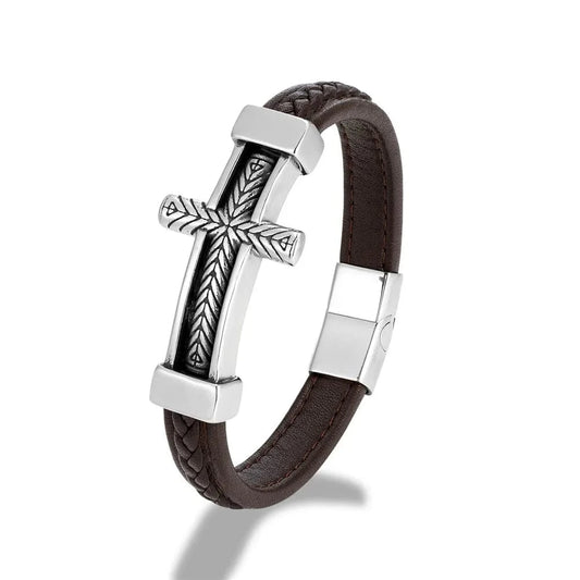Bracelet Cuir Homme Croix Élegante en Rouge et Noir avec Pièce Métallique Inoxydable