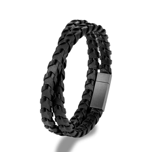 Bracelet Cuir Tressé Homme Noir Élegant avec Fermoir Magnétique.